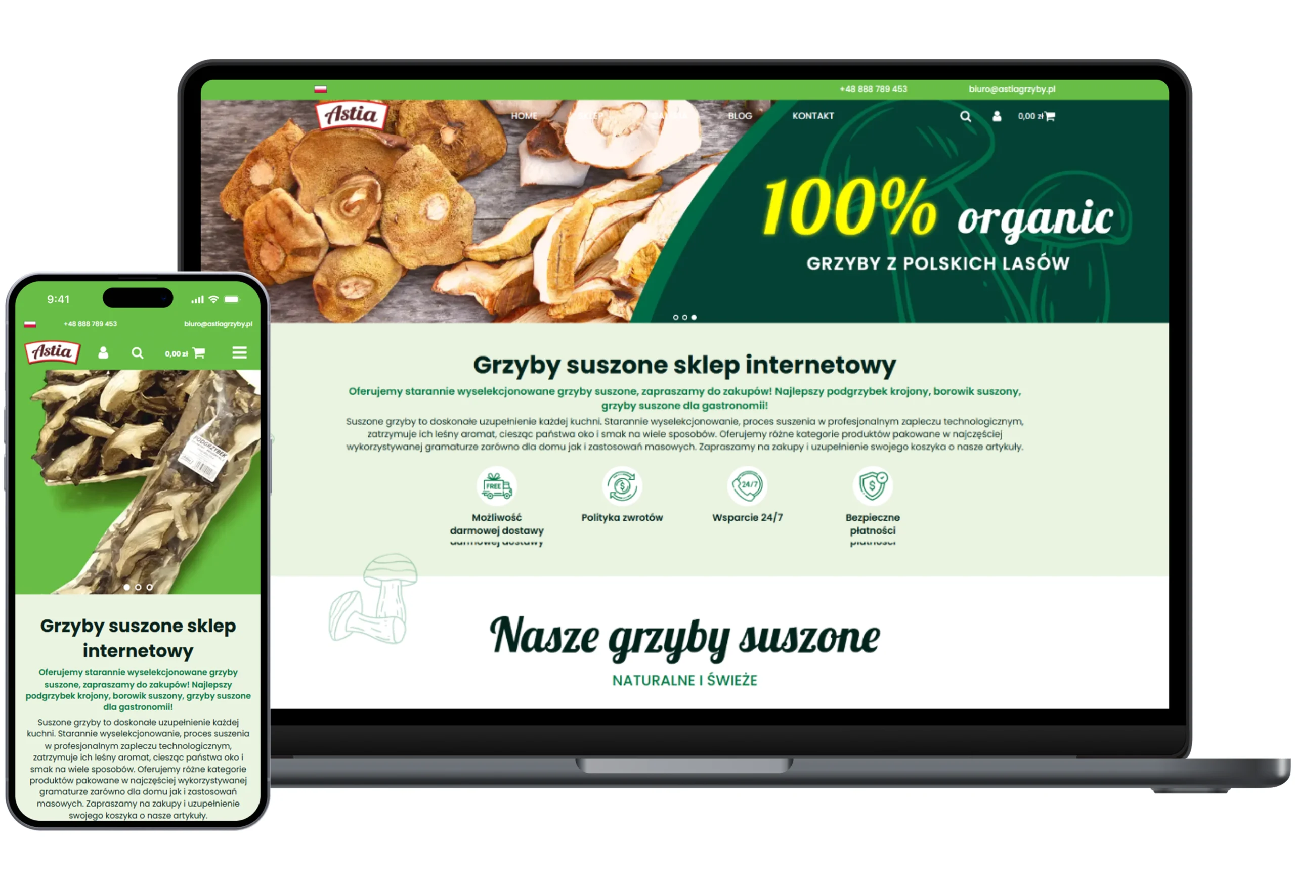 Strona e-commerce zawiera intuicyjny sklep internetowy z pełnym katalogiem produktów – od suszonych grzybów po gotowe mieszanki. Wprowadziliśmy również sekcję z przepisami, które inspirują klientów do kulinarnych eksperymentów. Całość zamyka storytelling o pochodzeniu produktów i wartościach marki.